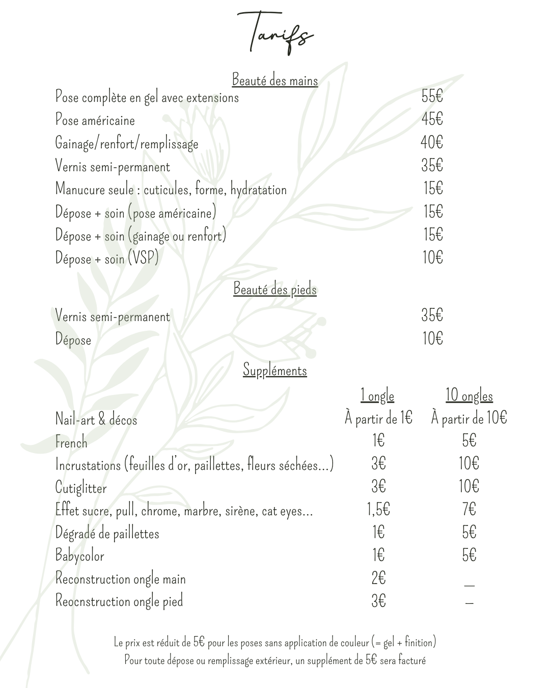 Je vous accueille du lundi au vendredi de 8h00 à 19h00 afin de sublimer vos mains au travers de vos ongles.